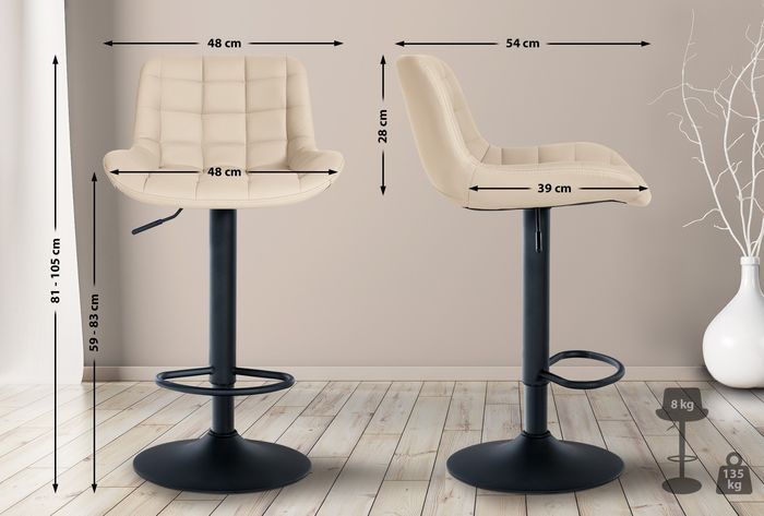 Dank des Metall-Gestells lassen sich diese Bar-Hocker um 360° Grad drehen und sind zudem höhenverstellbar, was eine individuelle Anpassung an die Bedürfnisse der Benutzer ermöglicht. Der stabile Fuss mit einer Fussstütze und Bodenschonern sorgt für zusätzliche Stabilität und ein angenehmes Sitzerlebnis auch über längere Zeit.