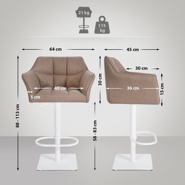 Die Rückenlehne und Armlehnen sorgen für zusätzlichen Sitzkomfort und eine entspannte Haltung. Der Barstuhl ist stufenlos höhenverstellbar, sodass die Sitzhöhe auf zwischen 58 bis 83 cm eingestellt werden kann. Die 360-Grad-Drehfunktion ermöglicht eine mühelose Bewegung. Dank der integrierten Fussablage können die Beine entlastet werden.
