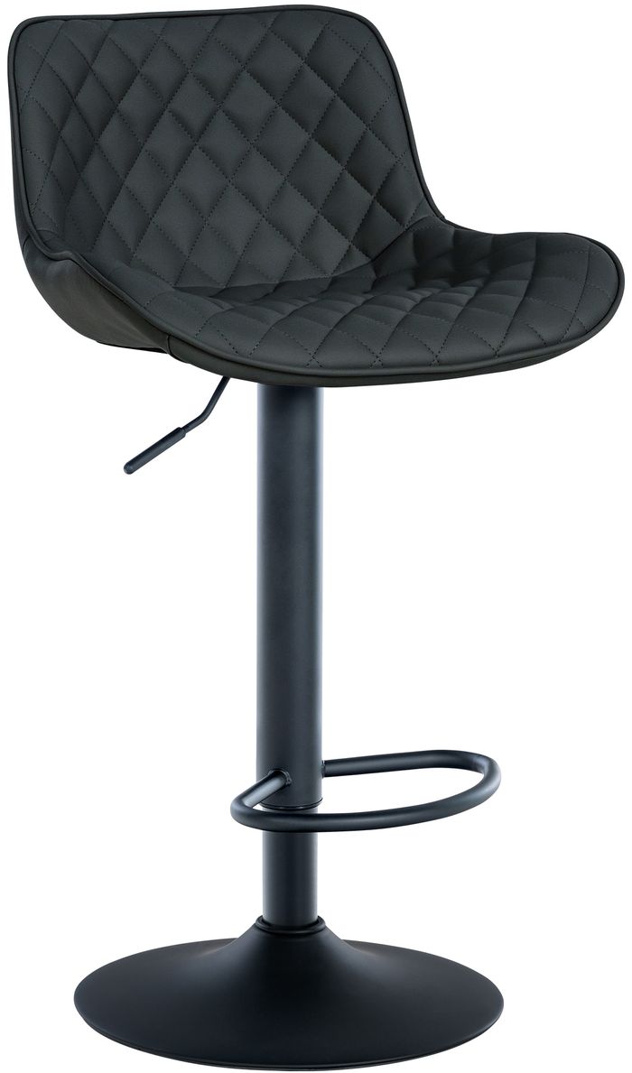 Die gesteppten Nähte an der Sitzfläche und Rückenlehne verleihen dem Hocker eine stilvolle Verzierung. Das Gestell ermöglicht eine 360-Grad-Drehung und Höhenverstellbarkeit, der stabile Trompetenfuss sorgt für einen sicheren Stand.