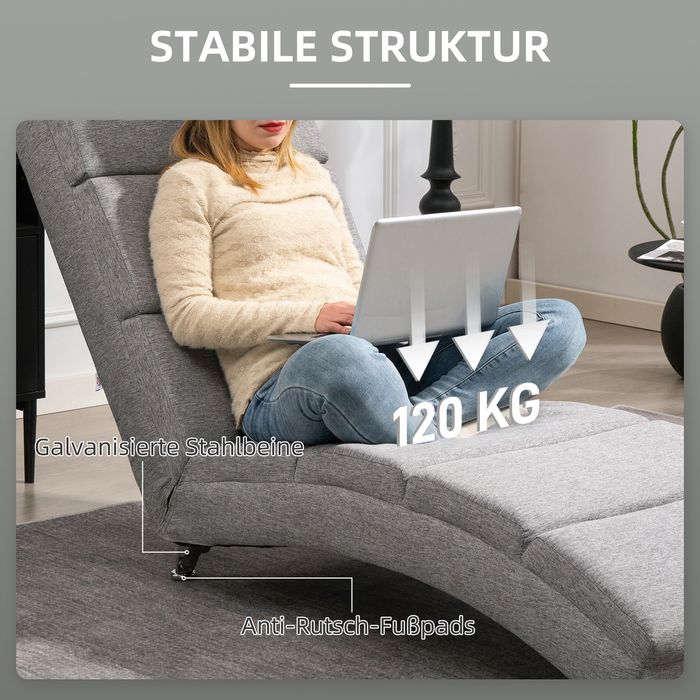 Erleben Sie höchsten Komfort mit dem, der in atmungsaktivem Stoff gehüllt und mit dichtem Schaumstoff gepolstert ist. Die 16 cm dicke Sitzfläche und Rückenlehne mit S-Federn sorgen für willkommene Gemütlichkeit. Das kanalgesteppte Design der Relaxliege verleiht jedem Raum, ob Wohnzimmer, Schlafzimmer oder Büro, einen besonderen Stil.