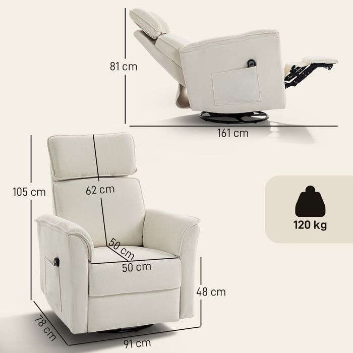 - Elektrische Relaxfunktion mit Fussstütze, sanfter Wippmechanismus und gleichmässiger Drehfunktion (nicht 360°) für vielseitige Entspannung