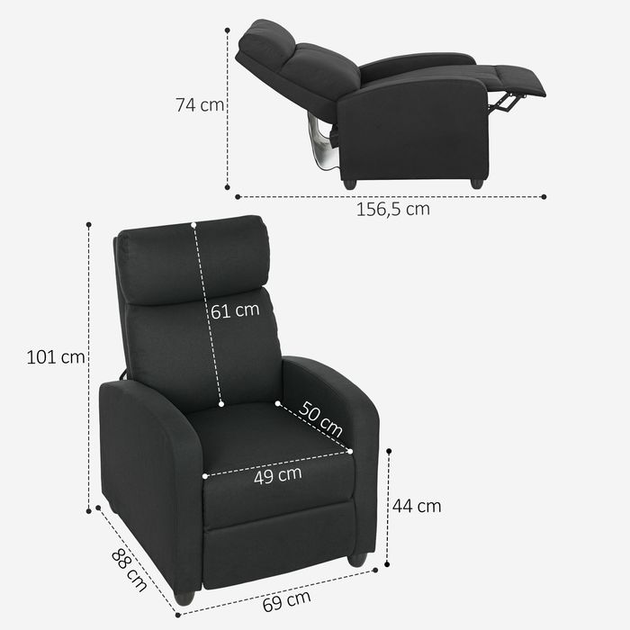- Produktdaten des TV-Sessels: Gesamtmasse (aufrecht): 69B x 88T x 101H cm. Liegeposition: 69B x 156,5T x 74H cm. Sitzmasse: 49B x 50T x 44H cm. Montage erforderlich