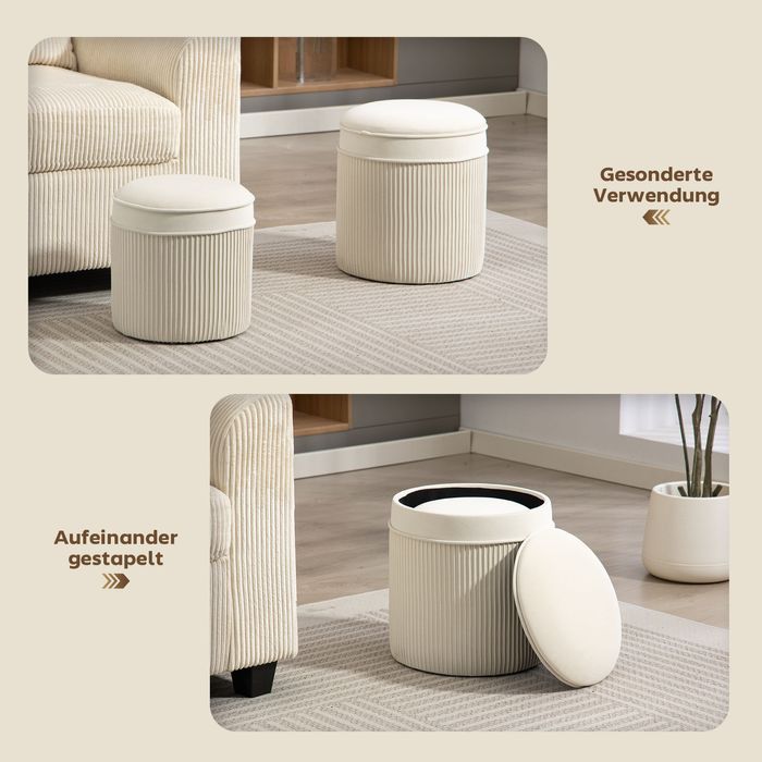 - Platzsparendes Design: Verstauen Sie den kleineren Sitzhocker mit Stauraum einfach im grösseren, um mehr Raum zu schaffen — ein intelligentes Design für eine offenere Raumgestaltung.