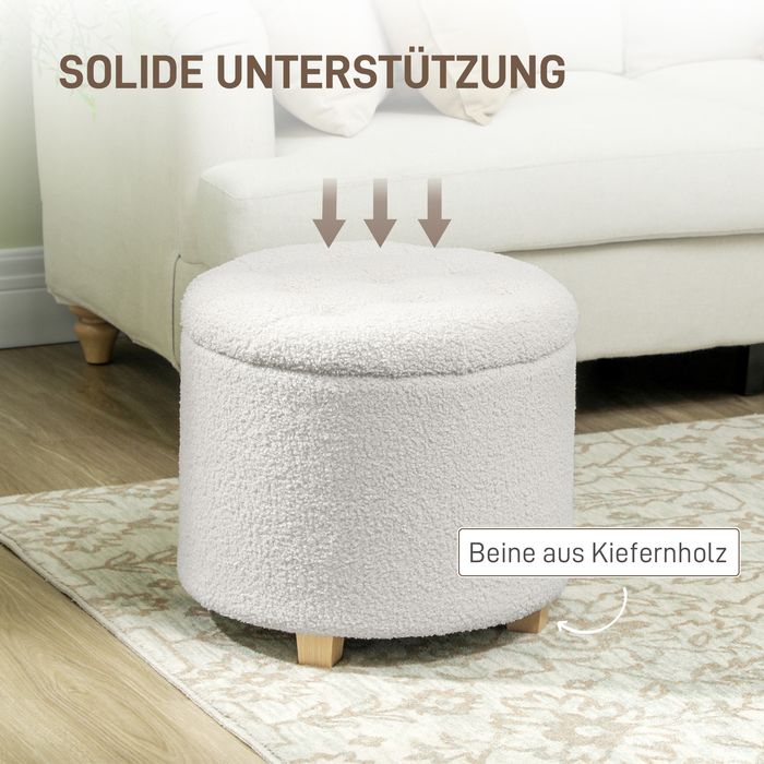 Sitzhocker mit Stauraum, Hocker mit Deckel, Runder Fusshocker, Aufbewahrungsbox, mit Holzbeinen, Weiss