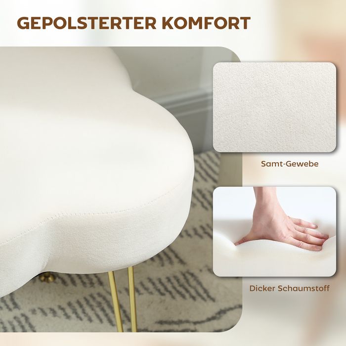 Verleihen Sie Ihrem Raum mit dem HOMCOM Ottomane in vierblättriger Kleeblatt-Form einen Hauch von Charme und Komfort. Dieser verfügt über verspielte Haarnadelbeine und einen luxuriösen, samtweichen Bezug. Die 10 cm dicke Polsterung des Polsterhockers bietet gemütlichen Sitzkomfort, während die verstellbaren Fusspads auf den Stahlbeinen auf jeder Oberfläche für Stabilität sorgen. Ideal für kleine Ecken oder Räume, die ein wenig Verspieltheit vertragen können.