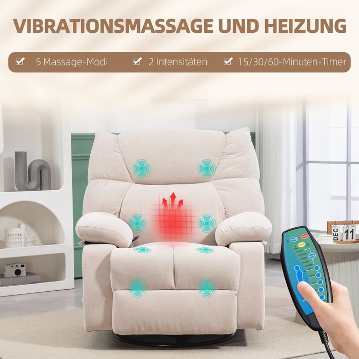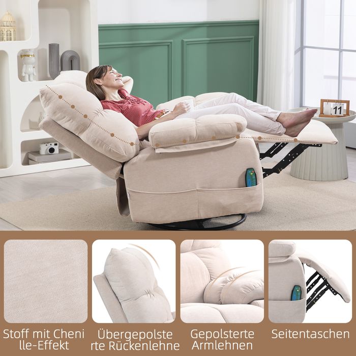 Massagesessel mit Wärme- & Liegefunktion, drehbar, bis 150 kg, Metallgestell, 98x90x98cm, Beige