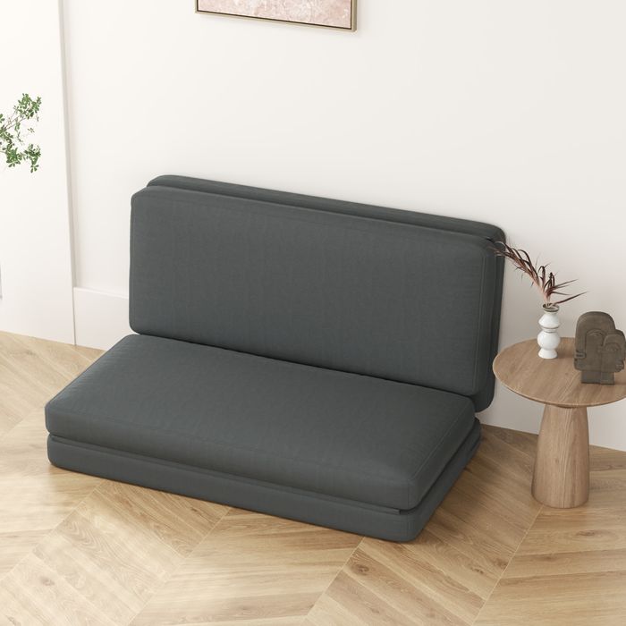 - Wechselt zwischen Sitzkissen, Bodensofa und Bett