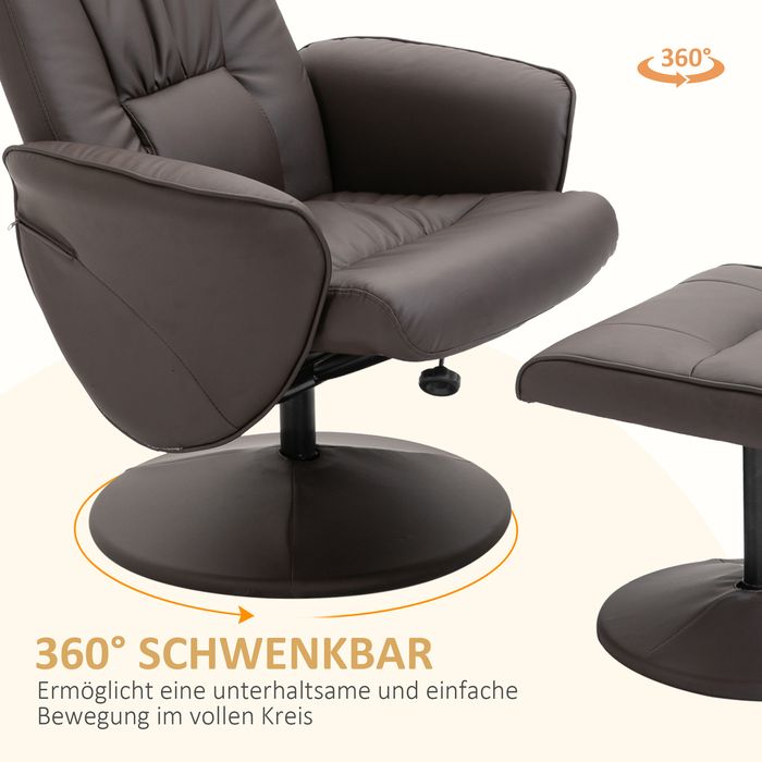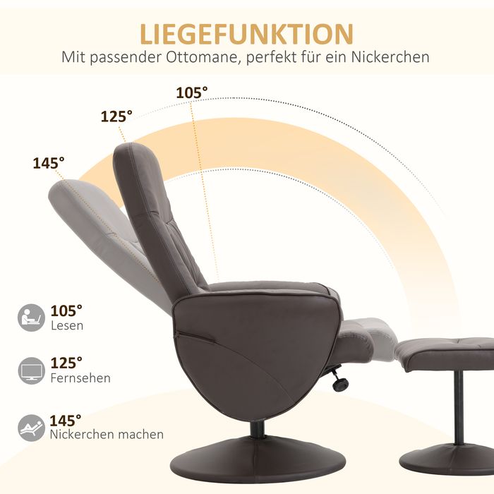 Nach einem langen Tag gibt es nichts Schöneres, als sich in einem grossen, bequemen Liegesessel zu entspannen. Dieses HOMCOM Set aus einem manuell verstellbaren Relaxsessel und einem Hocker hat alles, was Sie dazu brauchen. Rundum bequem gepolstert und mit glattem Kunstleder bezogen, bietet der Liegesessel eine hohe Rückenlehne und geschwungene Armlehnen und passt sowohl in Ihr Zuhause als auch ins Büro!