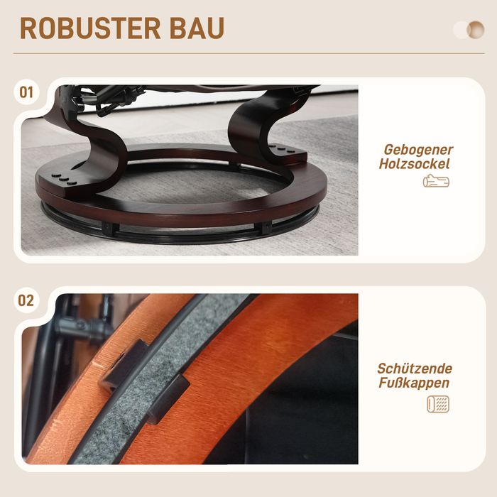 Entspannen Sie stilvoll mit dem Relaxsessel mit Hocker von HOMCOM, Ihrem neuen Partnerduo für ultimative Erholung! Lehnen Sie sich bis zu 130° zurück und geniessen Sie die Bewegungsfreiheit einer 360° drehbaren Basis sowie einer Schaukelfunktion. Gönnen Sie sich den Luxus unseres HOMCOM TV-Sessels, umhüllt von elegantem Kunstleder und eingebettet in einen stabilen Rahmen aus gebogenem Holz. Ideal fürs Wohnzimmer oder als stilvolle Ergänzung für Ihre Leseecke.