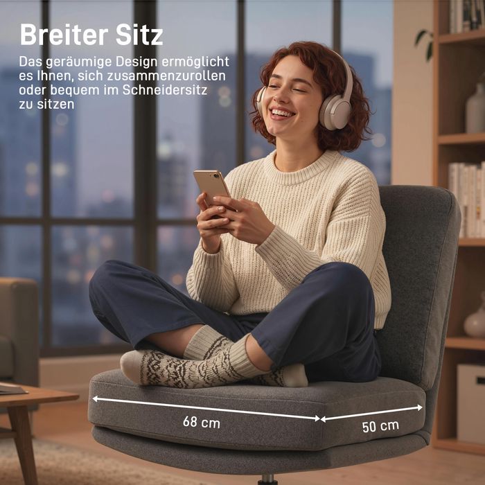 - Breiter Sitz: Der geräumige Sitz des Sessels (68x50 cm) und der grosszügige Fusshocker (62x52 cm) bieten viel Platz, um sich bequem zusammenzurollen oder im Schneidersitz zu entspannen. Dank der grosszügigen Masse ist dieses Set perfekt zum Lesen, Relaxen oder für gemütliche Filmabende.