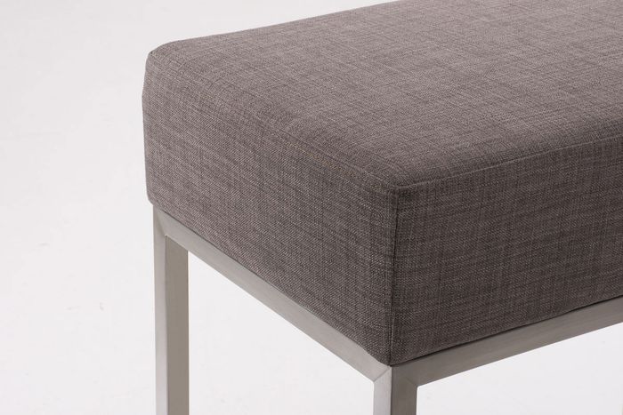 Unsere Design Sitzbank LAMEGA mit Edelstahlgestell und Stoffsitz überzeugt einzeln als bequem gepolsterte Sitzbank, die sich flexibel und formschön in den Raum integriert. Die dick gepolsterte Sitzfläche aus Stoff ist extrem angenehm zur Haut und verleiht dieser Sitzbank einen ganz besonderen Touch. Das hochwertige Gestell ist aus gebürstetem Edelstahl und bietet höchste Stabilität.