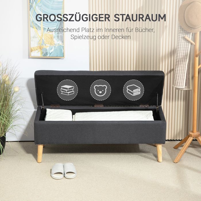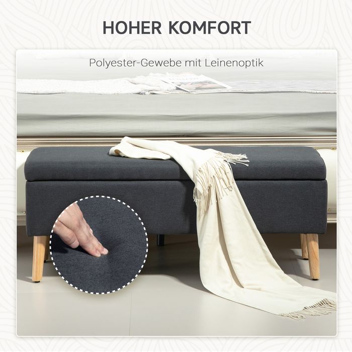 Polsterbank mit Stauraum, Bettbank in Leinenoptik, Kautschukholz, 110 x 39 x 45 cm, Dunkelgrau