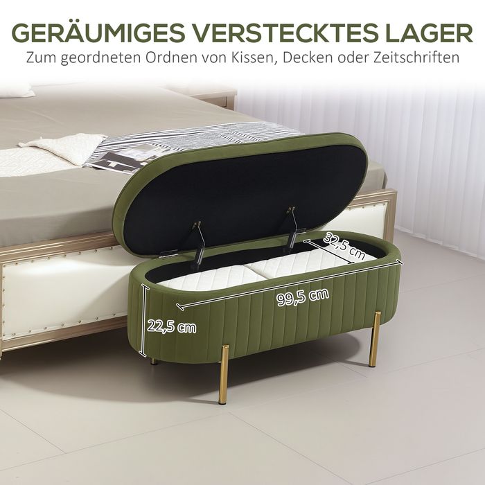 Beleben Sie jeden Raum mit der ovalen HOMCOM Bank, die elegantes Kanal-Tufting und schicke goldene Beine aufweist. Ideal als Bettbank, Flurbank oder gemütlicher Fensterplatz, vereint sie Stil mit Praktikabilität. Der versteckte Stauraum unter der klappbaren Sitzfläche und die samtweiche, Schaumstoff-gepolsterte Oberfläche der Polsterbank bieten Komfort und Luxus. Eine perfekte Kombination aus Eleganz und Funktionalität!