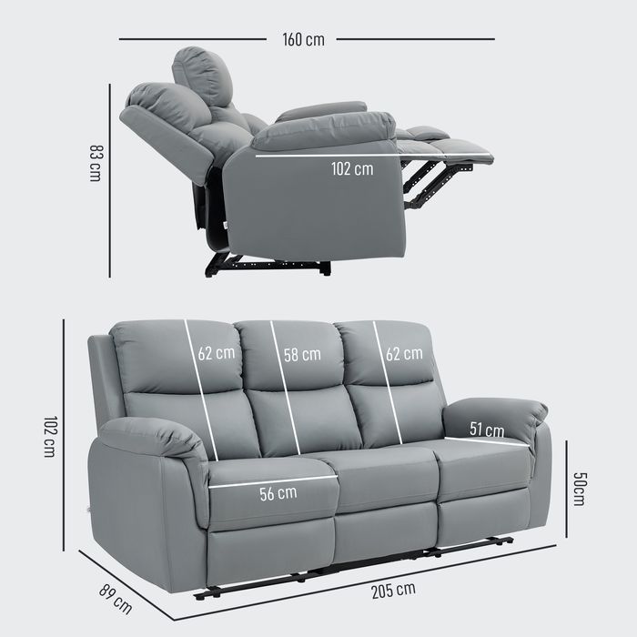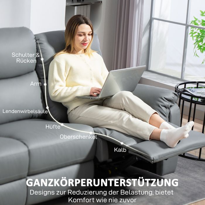 3-Sitzer-Sofa, linker und rechter Sitz zurücklehnbar, anpassbare Fussstütze, Kunstlederbezug, für Wohnzimmer, Dunkelgrau