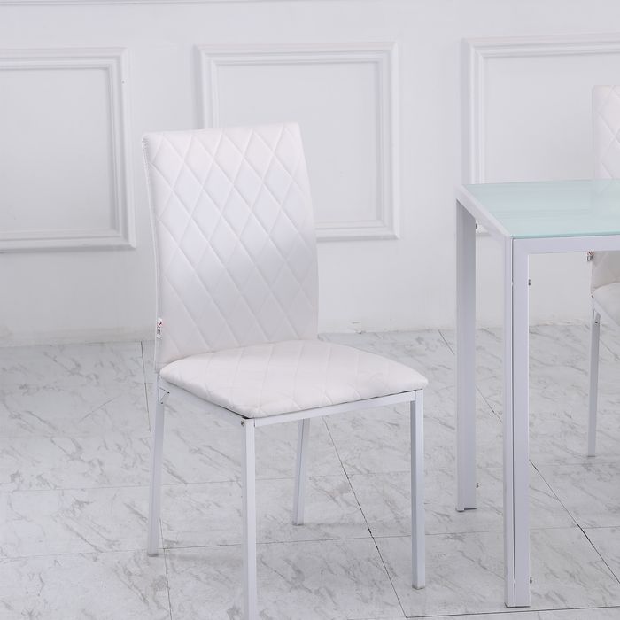 Schaffen Sie Platz für jeden Gast, mit dem Küchenstuhl-Set von HOMCOM, bestehend aus 4 modernen Stühlen. Die hohe Rückenlehne des Polsterstuhls bietet optimalen Halt und der gepolsterte Sitz mit Kunstlederbezug sorgt für einen maximalen Komfort. Der Metallrahmen macht die Esszimmerstühle robust und für den täglichen Gebrauch geeignet. Ausgestattet mit Bodenschonern, um Kratzer zu vermeiden.
