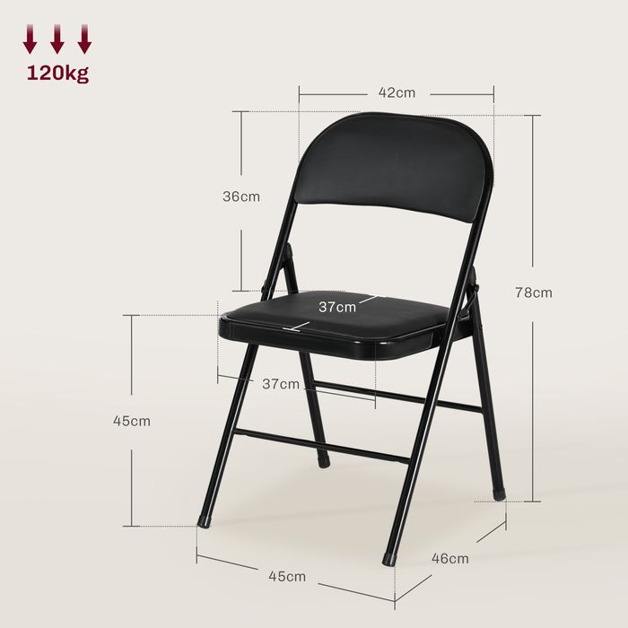 - Produktdaten der Klappstühle: Gesamtabmessungen: 45L x 46B x 78H cm, Sitzabmessungen: 37L x 37B x 45H cm, Klappmaße: 45L x 97B x 9H cm. Keine Montage erforderlich