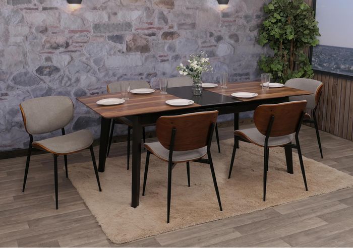 Erleben Sie stilvollen Komfort und zeitloses Design mit diesem exklusiven 6er-Set Esszimmerstühle, das Ihrem Wohnraum eine besondere Note verleiht. Die elegante, abgerundete Formgebung verbindet sich harmonisch mit dem edlen Bugholzgestell und schafft ein Erscheinungsbild, das gleichermassen modern wie klassisch wirkt. Der formschöne Sitzflächenbezug aus hochwertigem Stoff mit einer beeindruckenden Materialstärke von 370 g/m² überzeugt nicht nur optisch, sondern auch durch seine angenehme Haptik und Langlebigkeit.