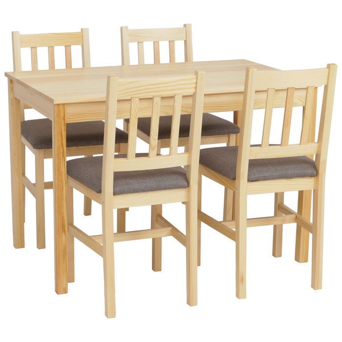 Diese elegante Essgruppe im klassischen Landhausstil vereint harmonisches Design, hohen Komfort und praktische Alltagstauglichkeit. Der formschöne Esstisch mit klaren Linien und vier passenden Stühlen mit charakteristischer Kreuzstrebe in der Rückenlehne verleiht jedem Raum eine warme, einladende Atmosphäre. Die Stühle bieten dank ihrer bequemen Polsterung ein angenehmes Sitzerlebnis, das zum langen Verweilen einlädt - ideal für gemeinsame Mahlzeiten, Familienfeiern oder gesellige Abende. Auch im Alltag überzeugt die Essgruppe durch ihre pflegeleichte Oberfläche, die schnell und unkompliziert zu reinigen ist. Mit ihrer kompakten Grösse eignet sich die Gruppe perfekt für Küchen, Esszimmer oder kleinere Wohnräume und schafft dort einen stilvollen Mittelpunkt. Diese Essgruppe im Landhausstil ist die ideale Wahl für alle, die ein harmonisches und gemütliches Zuhause schaffen möchten, in dem man sich gerne trifft, isst und gemeinsame Zeit geniesst.