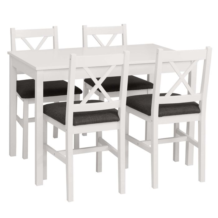 Diese elegante Essgruppe im klassischen Landhausstil vereint harmonisches Design, hohen Komfort und praktische Alltagstauglichkeit. Der formschöne Esstisch mit klaren Linien und vier passenden Stühlen mit charakteristischer Kreuzstrebe in der Rückenlehne verleiht jedem Raum eine warme, einladende Atmosphäre. Die Stühle bieten dank ihrer bequemen Polsterung ein angenehmes Sitzerlebnis, das zum langen Verweilen einlädt - ideal für gemeinsame Mahlzeiten, Familienfeiern oder gesellige Abende. Auch im Alltag überzeugt die Essgruppe durch ihre pflegeleichte Oberfläche, die schnell und unkompliziert zu reinigen ist. Mit ihrer kompakten Grösse eignet sich die Gruppe perfekt für Küchen, Esszimmer oder kleinere Wohnräume und schafft dort einen stilvollen Mittelpunkt. Diese Essgruppe im Landhausstil ist die ideale Wahl für alle, die ein harmonisches und gemütliches Zuhause schaffen möchten, in dem man sich gerne trifft, isst und gemeinsame Zeit geniesst.