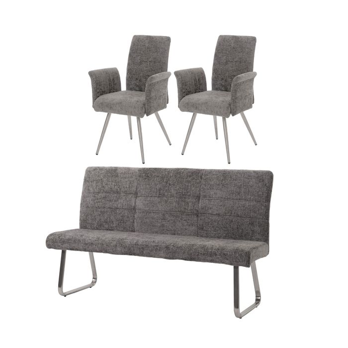 Esszimmer-Set HWC-G55, 2er-Set Stuhl mit Armlehne+Sitzbank 180cm, Edelstahl gebürstet Stoff/Textil Chenille – dunkelgrau