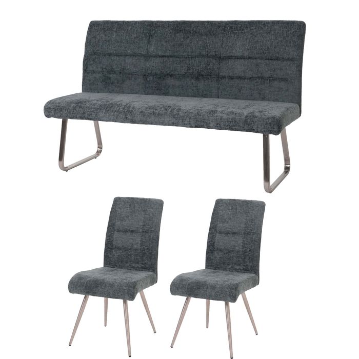 Esszimmer-Set HWC-G55, 2er-Set Stuhl + Sitzbank 160cm, Edelstahl gebürstet Stoff/Textil Chenille – blau-grün