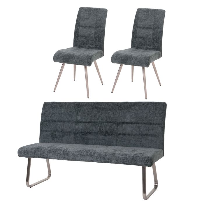 Esszimmer-Set HWC-G55, 2er-Set Stuhl + Sitzbank 180cm, Edelstahl gebürstet Stoff/Textil Chenille – blau-grün