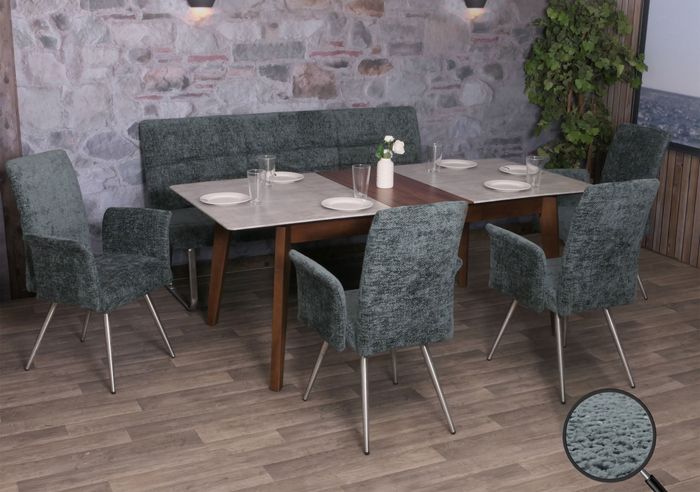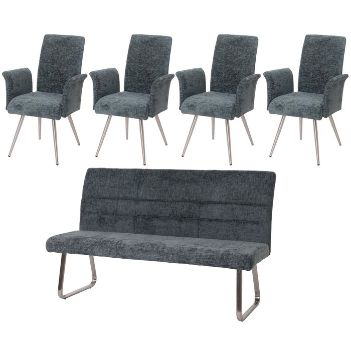 Esszimmer-Set HWC-G55, 4er-Set Stuh+D592l mit Armlehne+Sitzbank 180cm, Edelstahl gebürstet Stoff/Textil Chenille – blau-grün