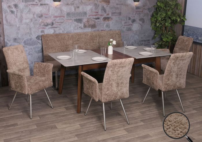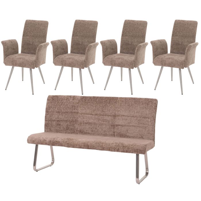 Esszimmer-Set HWC-G55, 4er-Set Stuhl mit Armlehne+Sitzbank 180cm, Edelstahl gebürstet Stoff/Textil Chenille – braun