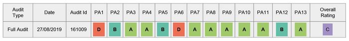 Soziales Managementsystem (PA1 = Note D), Arbeitnehmerschutz (PA2 = B), Recht auf Kollektivverhandlungen/Vereinigungsfreiheit (PA3 = A), Keine Diskriminierung (PA4 = A), Angemessene Vergütung (PA5 = B), Angemessene Arbeitszeit (PA6 = D), Arbeitssicherheit und Gesundheitsschutz (PA7 = A), Keine Kinderarbeit (PA8 = A), Arbeitsschutz für Jugendliche (PA9 = A), Keine Scheinbeschäftigung (PA10 = A), Zwangsarbeit (PA11 = A), Umweltschutz (PA12 = B), Ethisches Geschäftsverhalten (PA13 = A)