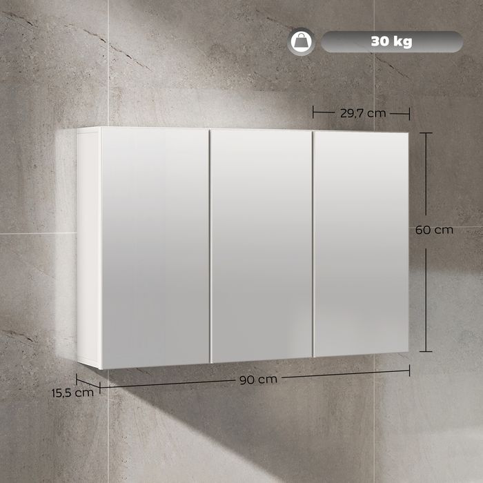 Badezimmerspiegelschrank, Badschrank mit 3 Spiegeltüren, Wandmontage, 90 x 15,5 x 60 cm, Spanplatte, Weiss