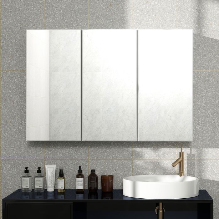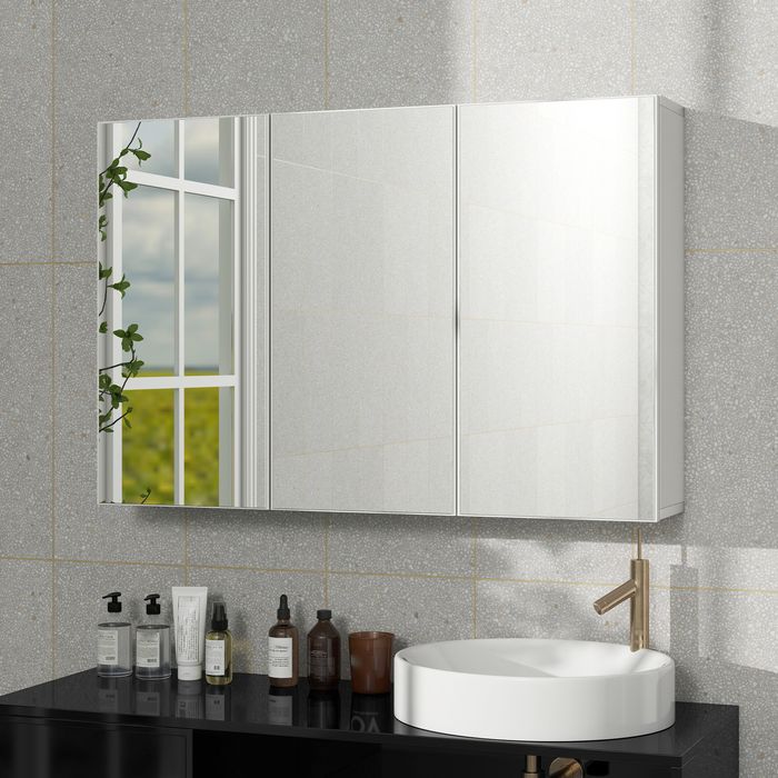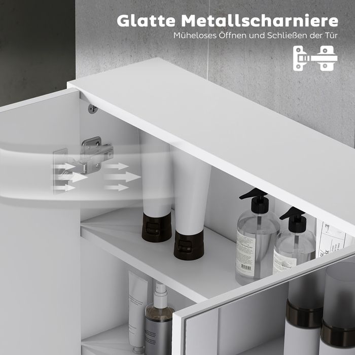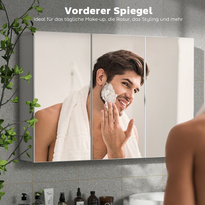 Der HOMCOM Badezimmerschrank mit Spiegel empfängt Sie jeden Morgen mit einem hellen, weiten Spiegelbild seiner drei Türen, was einen friedvollen Start in den Tag verspricht. Die wandmontierte Konstruktion des Badspiegelschranks spart Bodenfläche und erleichtert die Reinigung. Verschiedene Regale im Inneren sorgen zudem für anpassbare Aufbewahrungsmöglichkeiten für Toilettenartikel jeder Grösse. Verwandeln der Aufbewahrungsschrank Ihr Badezimmer in ein geordnetes, wohnliches Refugium.
