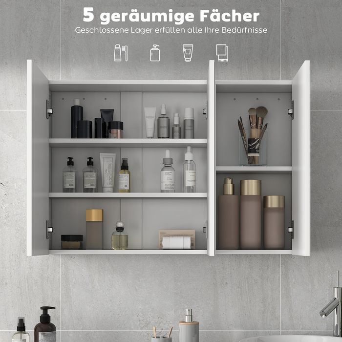 - ✔ Fünf Aufbewahrungsregale des Spiegelschranks organisieren Toilettenartikel, Kosmetika und Medikamente effizient