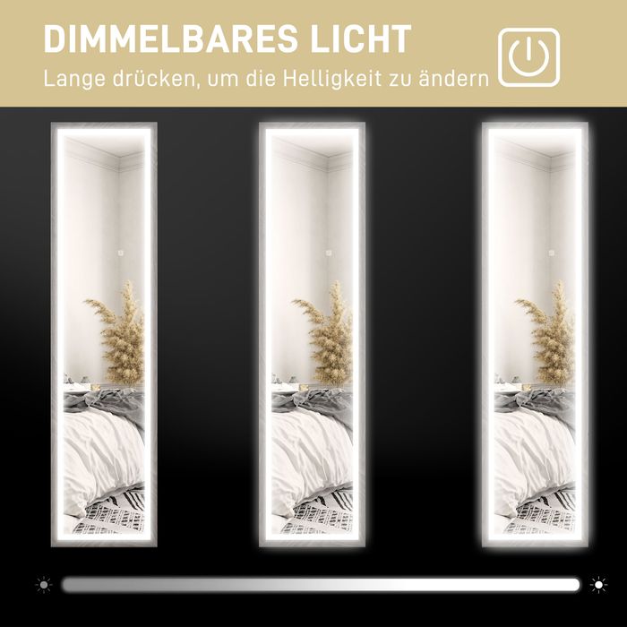 Erleben Sie Stil mit dem HOMCOM Bodenlängenspiegel, perfekt für eine komplette Ansicht von Kopf bis Fuss. Der grosszügige Spiegel von 160 x 40 cm ist von LED-Leuchten umrahmt und verfügt über einen Smart-Touch-Knopf. Wählen Sie spielend zwischen drei Lichtfarben und stellen Sie die Helligkeit je nach Stimmung ein. Ob stehend, lehnend im Schlafzimmer oder an der Wand im Flur – er verleiht jedem Raum einen eleganten Touch.