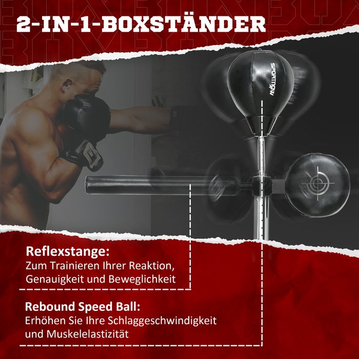 Dieser Boxständer von SPORTNOW ist ein vielseitiges Fitnessgerät, das Ihnen dabei hilft, Ihre Kraft, Geschwindigkeit, Genauigkeit, Koordination und Ausdauer zu verbessern. Der höhenverstellbare Speedball ist äusserst langlebig und verschleissfest dank seiner hochwertigen Kunstlederoberfläche, die zudem ganz pflegeleicht ist. Mit diesem Boxgestell von SPORTNOW können Sie Ihre Box- oder MMA-Fähigkeiten auf ein neues Level bringen, sei es als begeisterter Einsteiger oder Profi!
