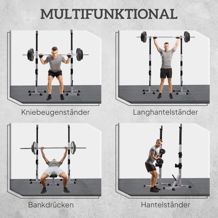 - Vielseitig: Dieser Hantelständer ermöglicht ihnen das Trainieren von Armen, Beinen, Taille, Hüften, Bauch. Ideal für Übungen wie Flach-, Schräg- und Schulterbankdrücken, Kniebeugen und vieles mehr.