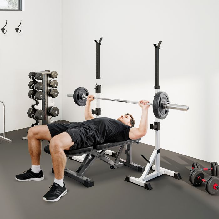- Freistehend: Dieser Hantelständer von HOMCOM enthält zwei freistehende Ablagen für Langhanteln.