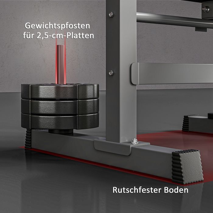 - Belastbarkeit: (Bank) 150 kg, (Hantelablage) 100 kg, (Jede Gewichtablage) 30 kg