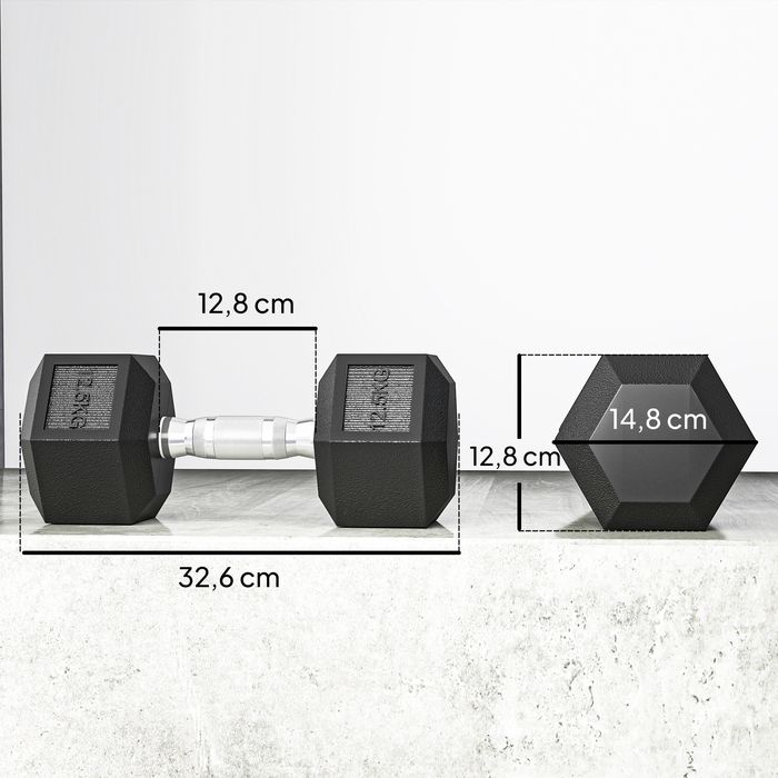 - Produktdaten zum Hanteln Set: Gewicht von Hanteln: 2 x 12,5 kg; Länge der Griffe: 12,8 cm; Sechseckgrösse: Ø14,8 cm (Diagonale)