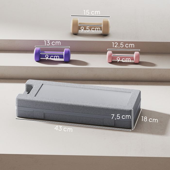 - Hantel-Abmessungen: 12,5L x 5B x 5H cm (0,5 kg), 13L x 6B x 6H cm (1 kg), 15L x 6,5B x 6,5H cm (1,5 kg)