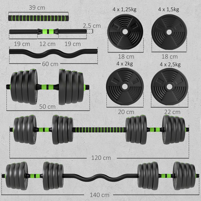 - Enthält 4 x 2,5 kg, 4 x 2 kg, 4 x 1,5 kg, 4 x 1,25 kg Scheiben, um das gewünschte Gewicht individuell anzupassen