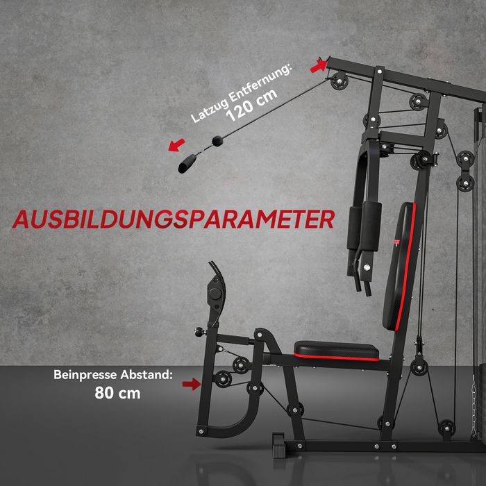 - ✔ Hochseilzug, Bruststation, Beinpresse für vielfältige Workouts