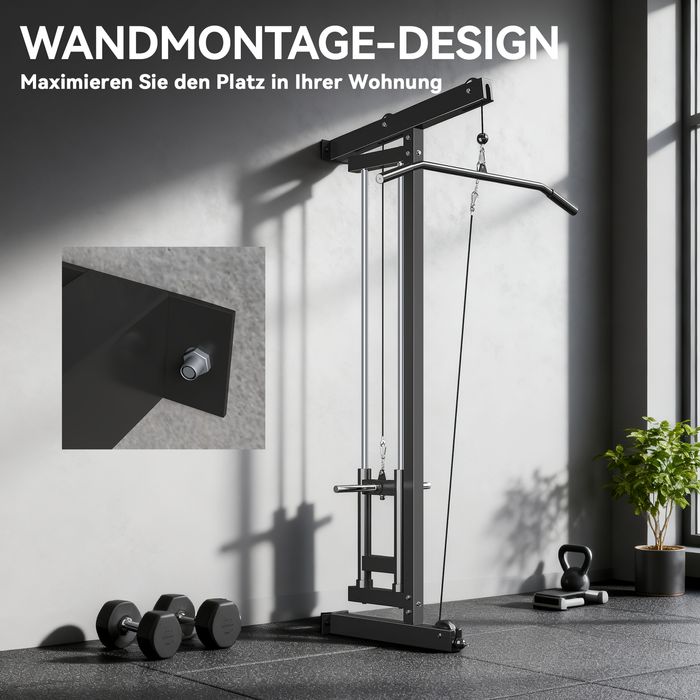Schwierigkeiten, ein vollständiges Workout in einem vollen Zuhause unterzubringen? Nutzen Sie jetzt die ungenutzte Ecke optimal! Dieser Wand Latzugturm macht aus wenig Platz eine persönliche Trainingsstätte. Mit dieser kompakten Kabelzugstation geniessen Sie Ganzkörpertraining – von Ruderübungen bis zu intensiven Dehnungen. Erleben Sie mit der Latzugmaschine Fitnessstudio-Qualität und Ordnung direkt bei Ihnen zuhause.