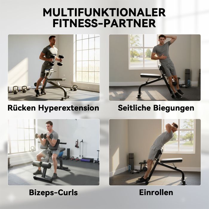 - Ganzkörpertraining Vielseitigkeit: Wechseln Sie nahtlos zwischen Römischer Stuhl, Sit-Up-Brett und verstellbarer multifunktionaler Hantelbank, um Bauchmuskeln, Gesäss und Rücken effektiv zu trainieren und Ihr tägliches Heimtraining spannend zu gestalten.