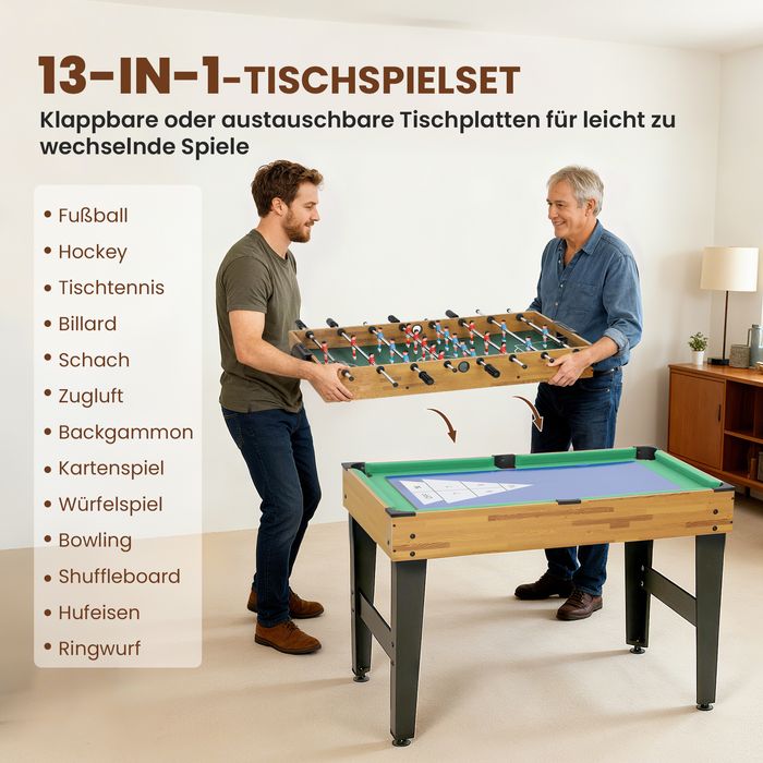 - 13-in-1 Multifunktionstisch: Erleben Sie 13 verschiedene Spiele mit nur einem Tisch dank einfach austauschbarer Tischplatten – von Tischfussball bis Schach. Ganz ohne zusätzliche Tische. Ein Tisch, endloser Familienspass und freundschaftlicher Wettkampf.