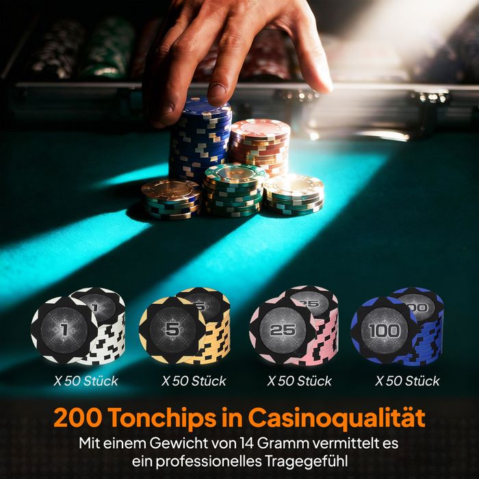 - Authentische Tonchips in Casinoqualität: Sie liegen glatt und angenehm in der Hand, sind mit 14 g professionell gewichtet und bieten einen klaren Klang und ein erstklassiges Spielgefühl. Sie lassen sich leicht mischen und sicher stapeln, sodass Sie im Falle eines grossen Gewinns eine beeindruckende Pokerchip-Festung errichten können.