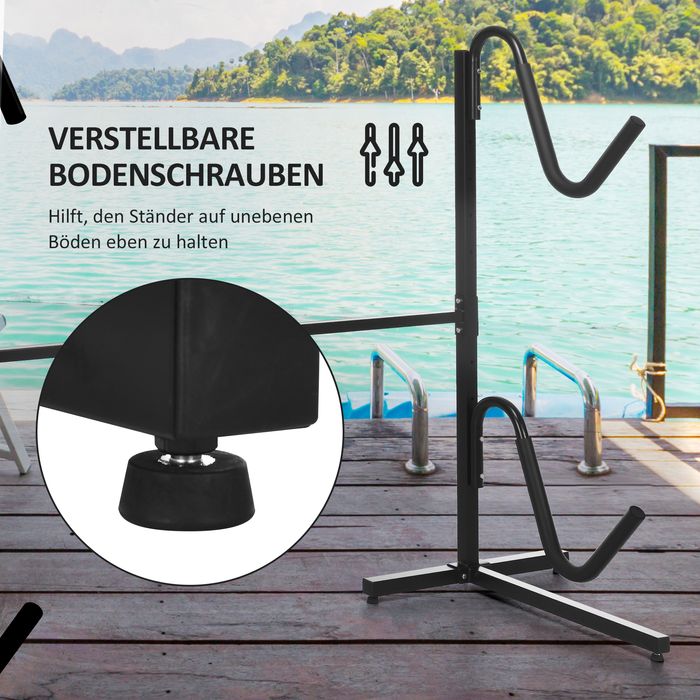 Unser Kanugestell von bietet mühelos Platz für zwei Kajaks oder Stand-Up-Paddle-Boards. Hergestellt aus robustem Stahl, eignet sich dieser Kajak-Halter sowohl für den Innen- als auch den Aussenbereich. Mit verstellbaren Füssen, die ihn auf unebenem Terrain stabil halten, und einer grosszügigen Polsterung an den Haltebügeln, schützt er Ihre Ausrüstung zuverlässig vor unschönen Kratzern oder Beschädigungen. Gönnen Sie Ihrem Wassergefährt die Aufbewahrung, die es verdient!