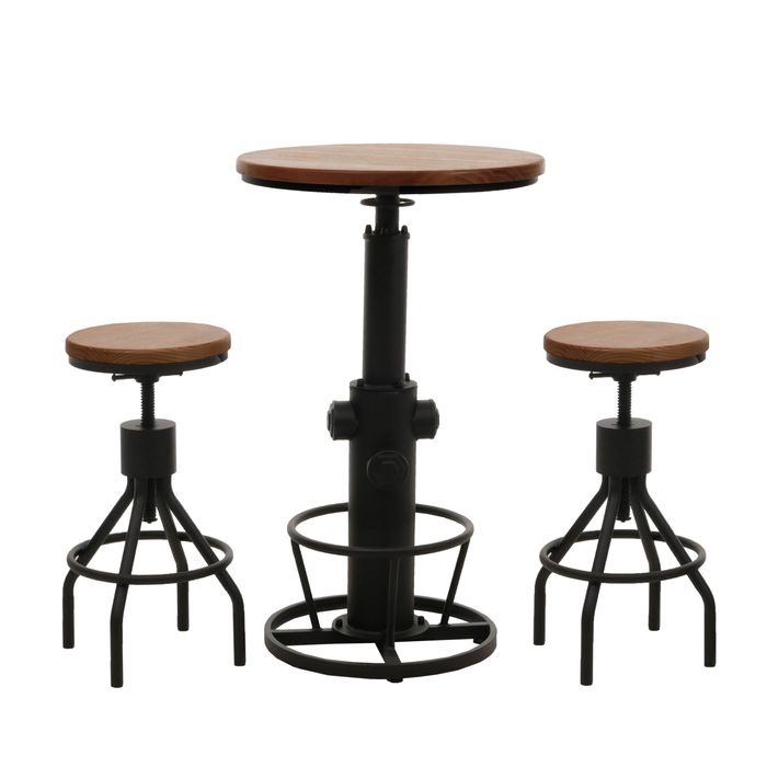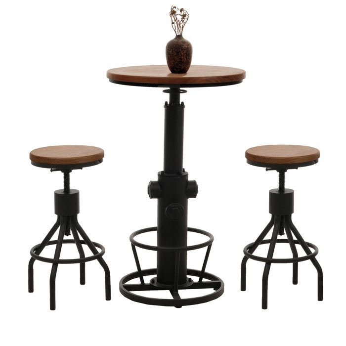 - Das Barset umfasst einen um 360° drehbaren Tisch und zwei drehbare Barhocker - stufenlos höhenverstellbar. Das stabile Gestell aus Metall bietet Sicherheit, während die Sitzfläche und Tischplatte aus Holz für eine ansprechende Optik sorgen.