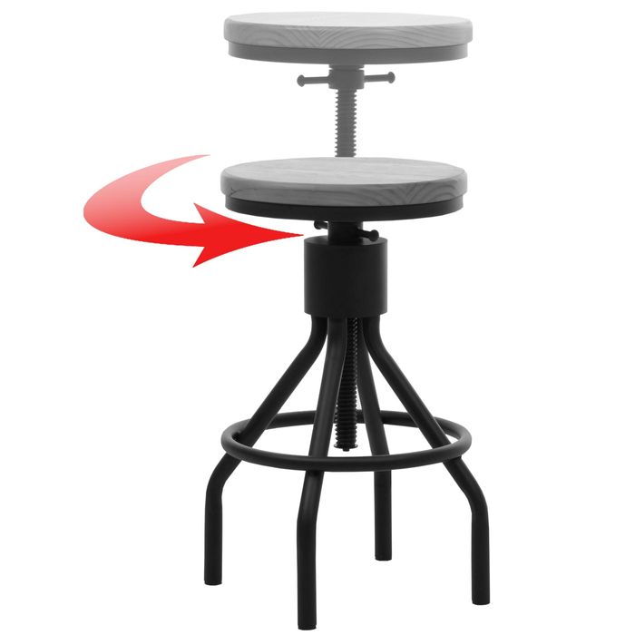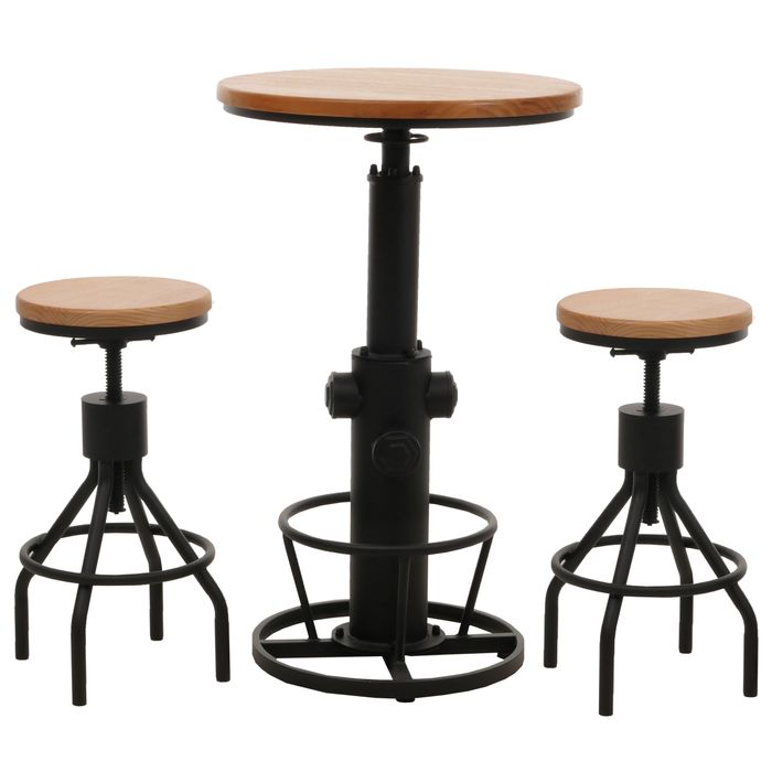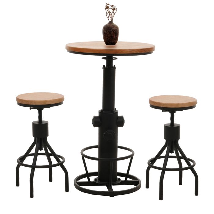 - Das Barset umfasst einen um 360° drehbaren Tisch und zwei drehbare Barhocker - stufenlos höhenverstellbar. Das stabile Gestell aus Metall bietet Sicherheit, während die Sitzfläche und Tischplatte aus Holz für eine ansprechende Optik sorgen.
