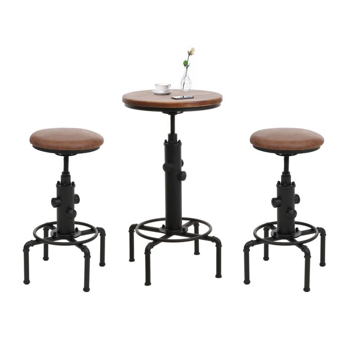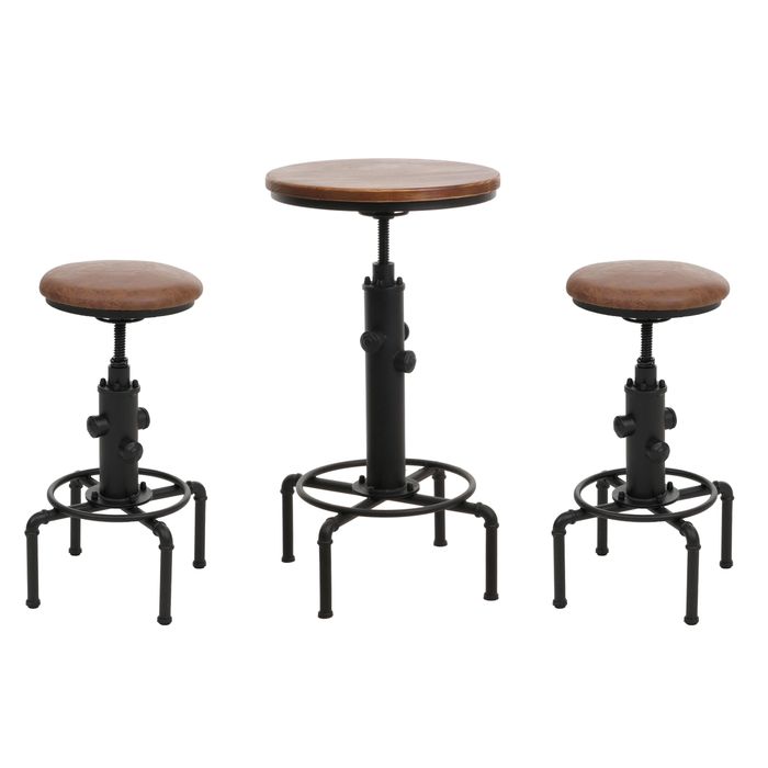 - Das Barset umfasst einen um 360° drehbaren Tisch und zwei drehbare Barhocker - stufenlos höhenverstellbar. Die stabilen Eisengestelle bieten Sicherheit, während die Sitzflächen aus Kunstleder und die Tischplatte aus Holz für eine ansprechende Optik sorgen.