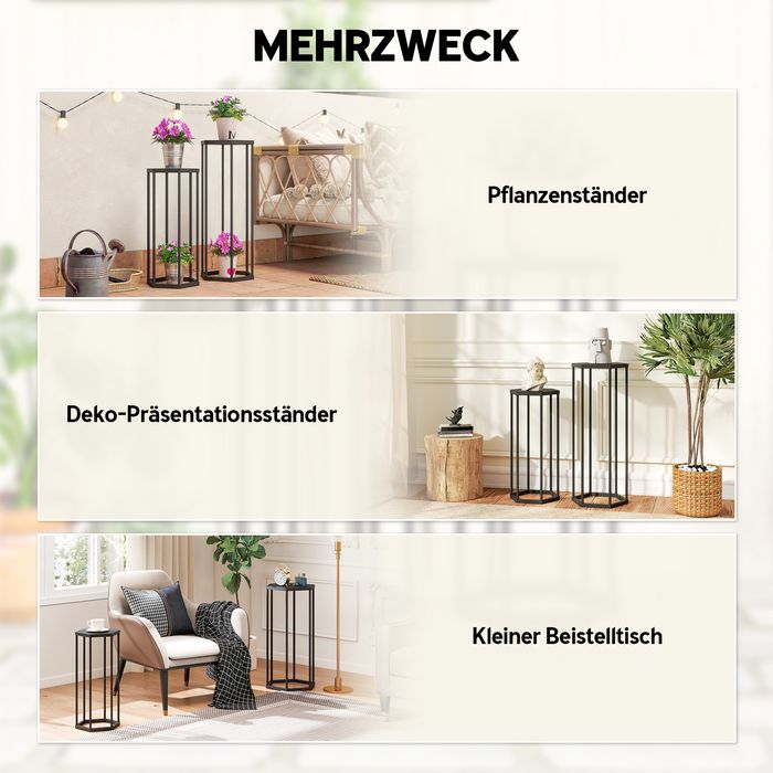 Das 2-teilige Pflanzenständer Set von bringt Höhe, Balance und Stil in jeden Raum. Mit Höhen von 75 cm und 60 cm können Pflanzen oder Deko platzsparend arrangiert werden. Das hexagonale Design des Blumenhockers sichert Töpfe stabil. Pulverbeschichtetes Metall schützt vor Wasser und Rost, ideal für drinnen und draussen – perfekt für Pflanzen, Laternen, Kunst oder saisonale Akzente im Wohnzimmer, Balkon, Patio oder Eingangsbereich.